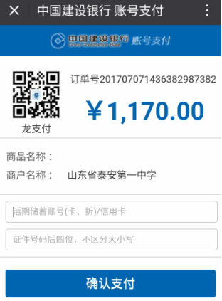 图3选择缴费项目 3、点击【缴费】,进入支付方式选择页面,如图4: 图4选择支付方式 4、若选择【建行支付】,进入建行付款界面,输入建行账号、预留开卡人身份证号码后四位,点击【确认支付】,系统会向开卡时预留的手机号发送验证码,此时输入短信验证码完成支付,页面自动跳转为支付成功。如图5、图6所示: