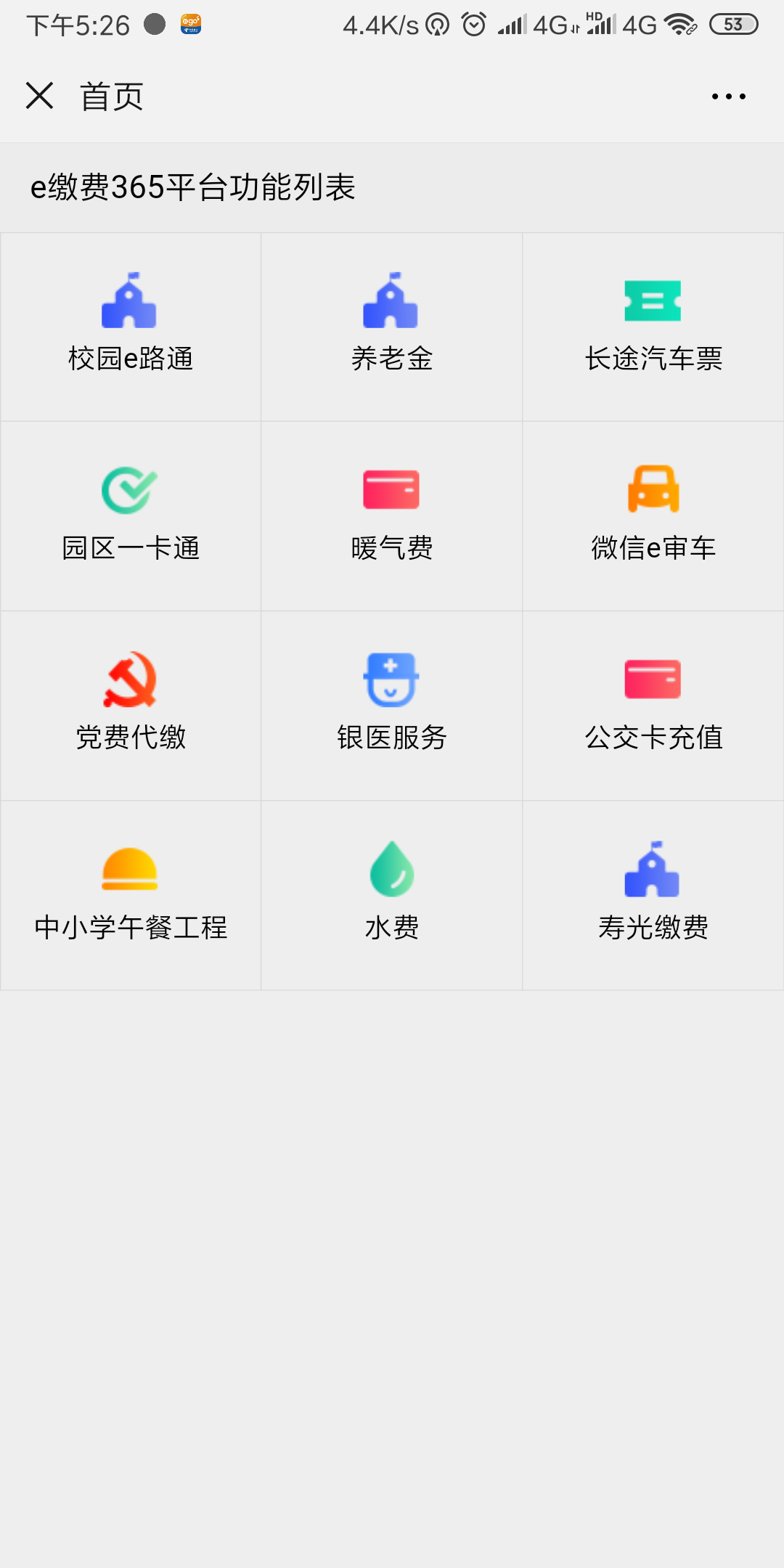 图1 1、扫描成功后,点击【业务办理】,选择e缴费365,随后选择校园e路通,页面如图1所示,进入下一页菜单,再如图2 所示:选择【缴费】菜单, 【城市】下拉列表中选择【泰安】,【单位】下拉列表中选择【开云网页版-开云(中国)官方在线登录 】,输入编号(学生身份证号)、输入姓名,点击【查询】。